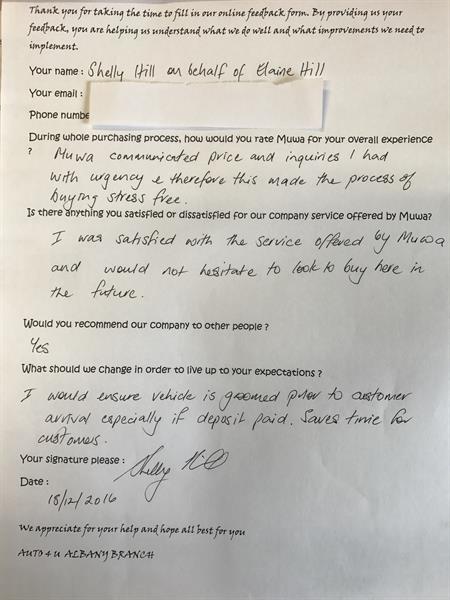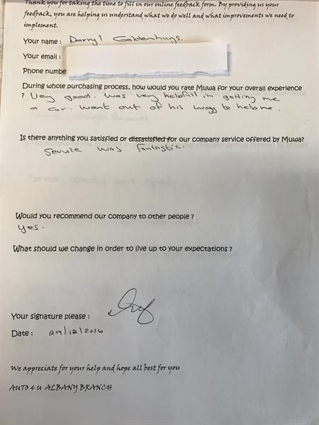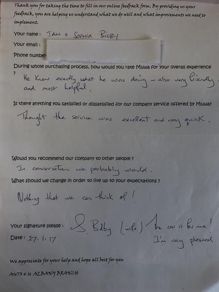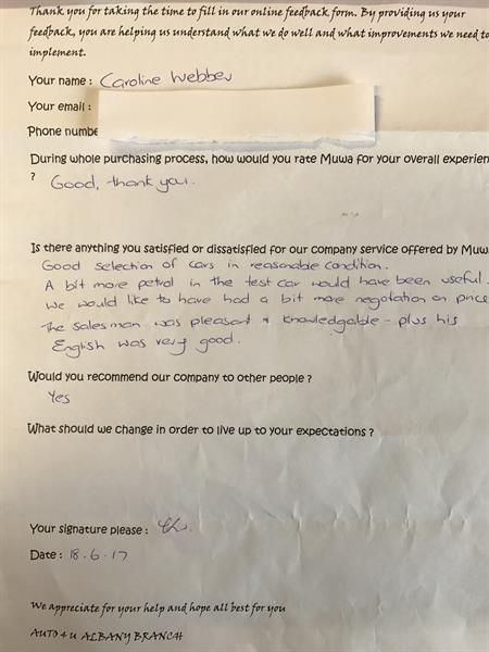 I was satisfied with the service offered by auto4U and would not hesitate to look to buy here in the future.