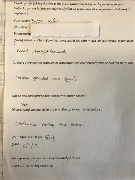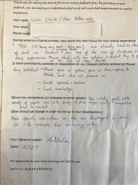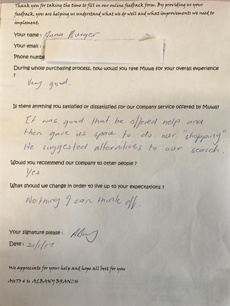 Very satisfied: Auto4U gave us options,time and space to decide and did not pressure us.